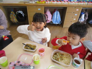 「ドラキュラやん!」「そうだよね!」と友だちと顔を見合わせたり、ガイコツが出てくると「キャー‼」と手で顔を隠したり、かわいい姿がありました。みんなが楽しみにしているカレーライス。