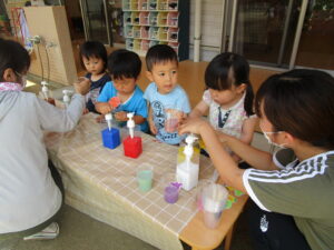 プール遊びが始まる前に、いろいろなクラスでどろんこ遊びやシャボン玉などの水遊びを楽しみました。