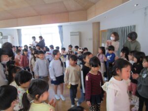 年中組さんからは「いっぱい遊んでくれてありがとう」「小学校に行っても頑張ってください」と温かい言葉のプレゼントがありました。