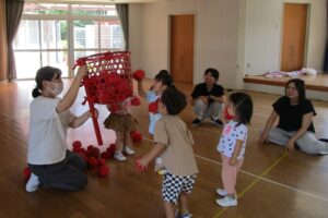 昨日はたんぽぽ組のミニ運動会がありました。赤組はどんどん玉をカゴに入れていましたよ♪