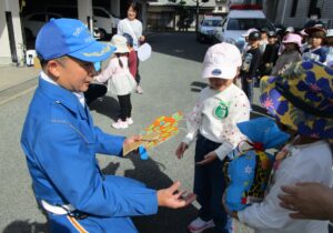 昨日は、みんなで持ち寄った果物とカードを、日頃お世話になっている方々へ届けに行きました。 バスの先生、給食室の先生、みんなの暮らしの安全のために働いてくださっている方々・・・