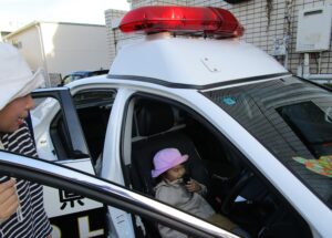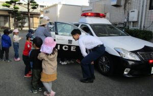 年中組は警察署へ。 子どもたちからの質問は、「ポケットに何が入っていますか?」「ドロボーを見たことがありますか?」などなど・・・。警察の方が丁寧に答えてくれて、本物の警棒や手錠を見せてくれました。