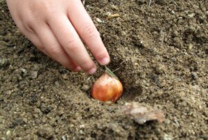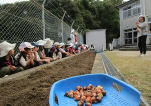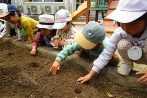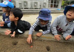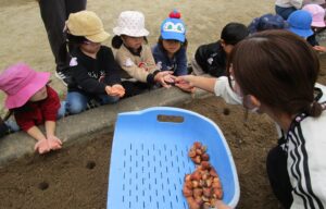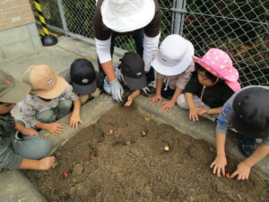 「球根の中には、神さまがくださった命があるよ。寒い冬を乗り越えて春が来ると、神さまがそれを教えてくれて、お花が咲くんだよ。」と各クラスで先生の話がありました。