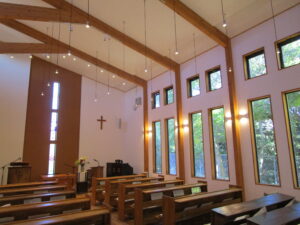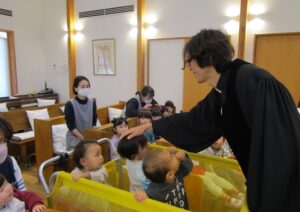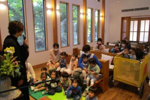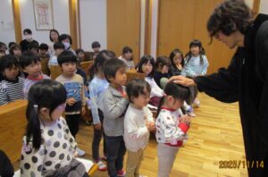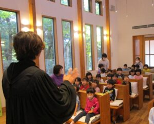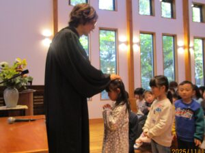 小さいお友達は、讃美歌『ひとりひとりのなをよんで』を、年長組は『アーメンハレルヤ』を歌い、聖書の話に耳を傾けました。「静かに礼拝を守る場所だよ」とお話ししていたので、みんな少しだけ緊張しながら、落ち着いた雰囲気の中で祝福式を行うことが出来ました。