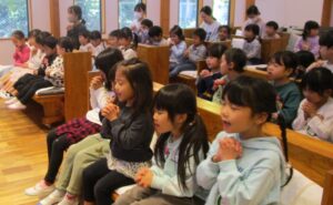 この後のお昼ごはんの時、食前のお祈りで、お当番さんが「今日は、子ども祝福式がありました。一人ひとりが愛されました。」とお祈りしたクラスもありました。