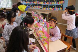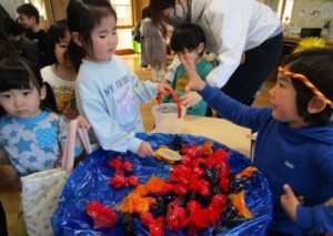 【ぶどう組】ぶどう組もお祭り屋さんで、『ぶどうまつり』。ワニワニパニックは、出てくるワニをしっかり叩いて!先生も本気モード!タイマーで合図が鳴ったら、次の人と交代です。金魚すくいをする顔は、みんな真剣そのもの!