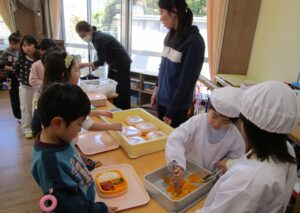 年長組のクラスでは、小学校に向けての給食当番や配膳に取り組んでいる様子も見てもらうことが出来ました。