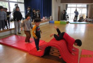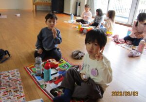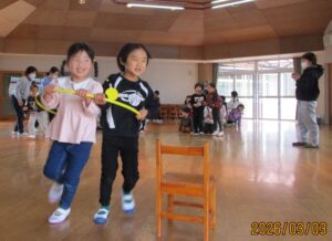 3月3日(火)は、年中組の園外保育が予定されていましたが、あいにくの天候の為、ゆり組とぶどう組合同のレクリエーション遊びに変更されました。
