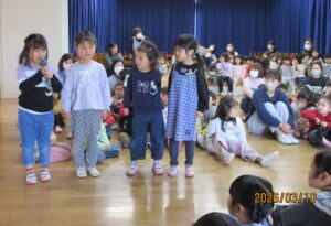 はじめに、年中組代表のお友達がメッセージを贈りました。「いつも優しい年長組さんが大好きでした!ずっと忘れません。」そして、みんなで「年長組さん、ありがとうございました!」と声を合わせて言いましたよ。