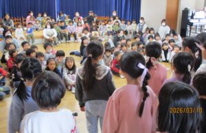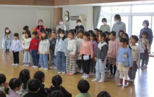 そして、年長組さんからも、暖かいお返しのメッセージが。「幼稚園のお友だち、たくさん一緒に遊んだね。1年生になっても頑張ります。みんなも元気でね!」そして綺麗な歌声で、讃美歌『たとえばわたしが』をみんなに聴かせてくれました♪