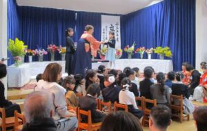 クラスの先生から名前を呼ばれたら、手を挙げて返事をし、ステージへ登ります。そして園長先生から、一人ずつに卒園証書が渡されます。お友だち、先生たち、お家の方・・・みんなに見守られ、たくさんの拍手が送られました。